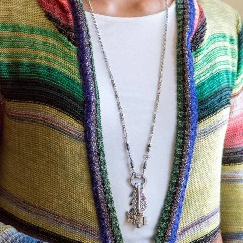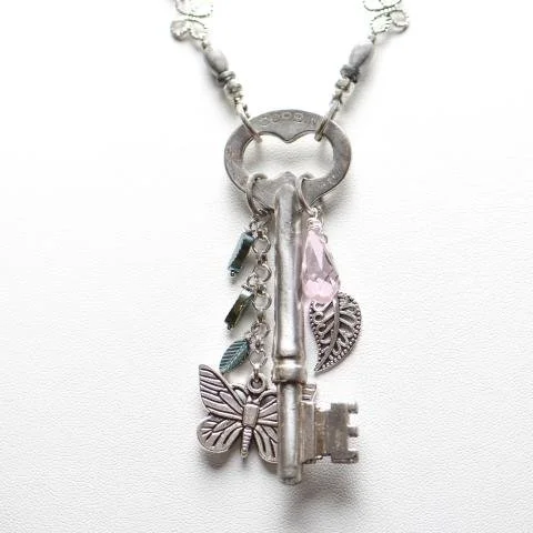 Vintage skeleton key with silver tone butterfly and leaf charms with pale rose crystal teardrop. Soft green leaf beads hang above butterfly. Silver tone chain has a pattern of grey and silver beads.