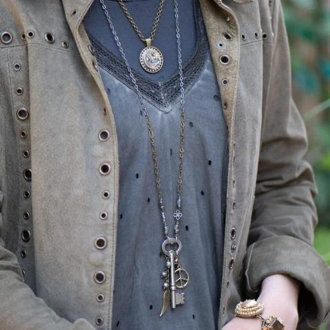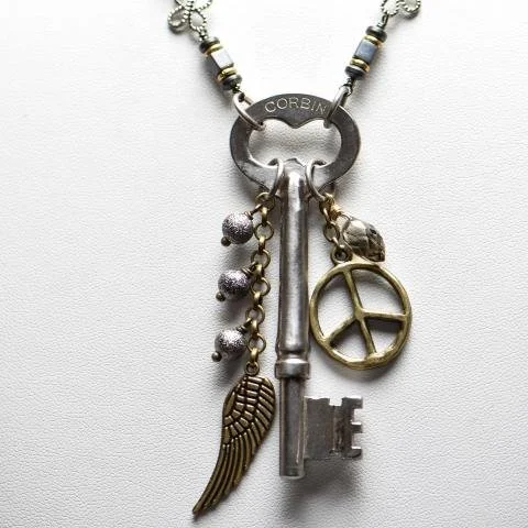 Vintage skeleton key with peace sign and wing charms with smokey quartz teardrop. Brass chain mixes with gunmetal accents.