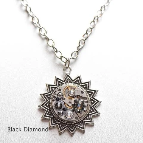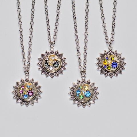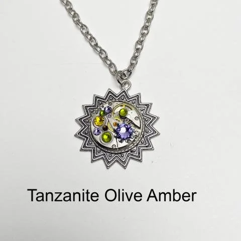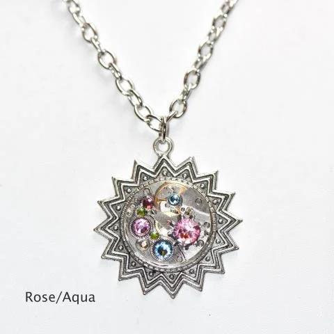 Colorful sun shaped pendant with inside workings of watch. Vintage watches get a new life accented with crystals. Pendant comes with the 24” chain. Other chain length available upon request.